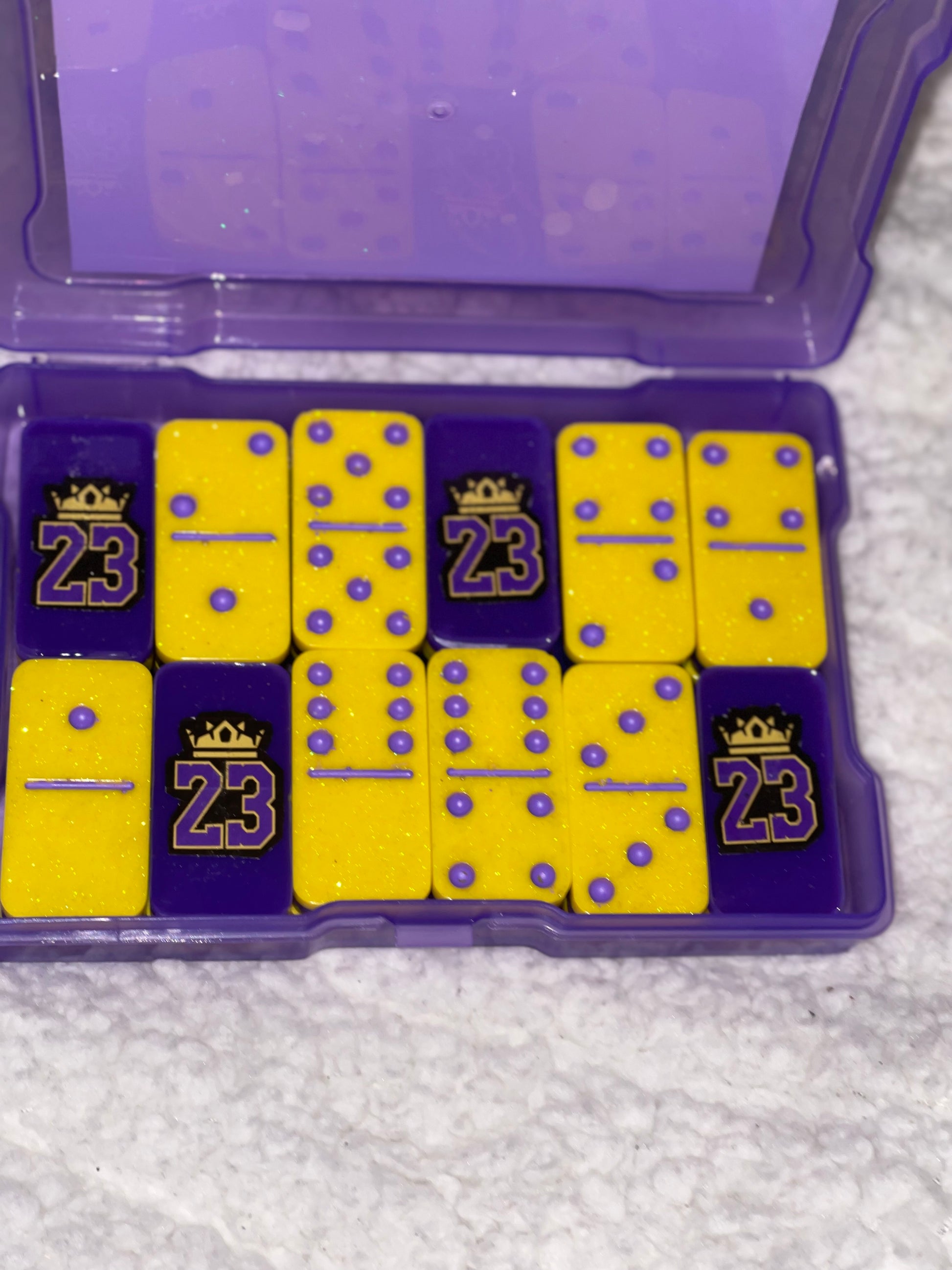 Custom handmade dominoes are made to order. These dominoes can be made in your favorite colors (up to 2) and can include a photo or the logo of your favorite sports team, sorority or fraternity, school, person, or theme. Your set will come in a plastic container.